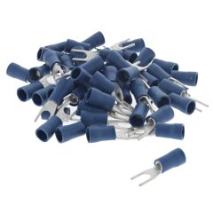 Piggy‐back spade terminals, piggy‐back push‐on terminals, double‐connect spade terminals, piggy‐back female receptacles, quick‐disconnect piggy‐backs, tab terminals, blue insulated crimp terminals for 6.30mm blades.