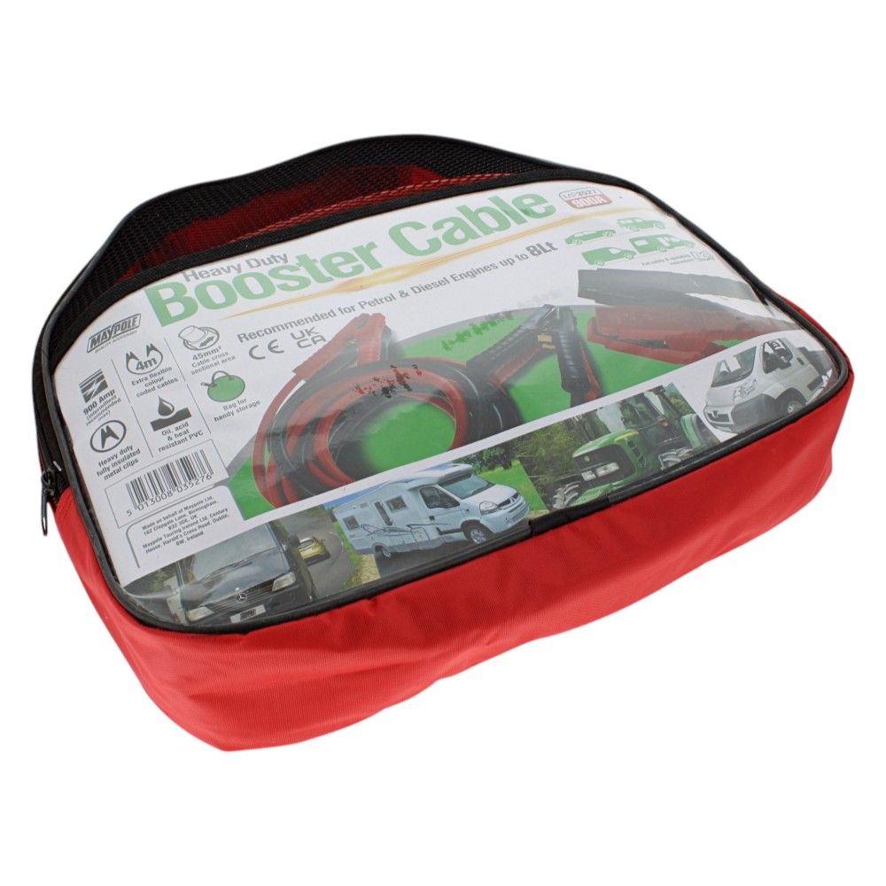 The Maypole MP3527 Booster Cable set is a heavy-duty pair of battery leads designed for reliable jump-starting of larger vehicles. Each lead uses copper-coated aluminium conductors with a 45 mm2 cross-sectional area for strong current delivery and controlled flexibility. The 4 m length provides comfortable reach between vehicles in awkward positions. Heavy-duty, fully insulated metal clamps grip battery terminals securely, and colour-coded red/black insulation helps prevent polarity mistakes. The PVC jacket is resistant to heat, oil, and acids for long service life. With a peak output of 900 A and suitability for engines up to 8 litres, these leads are a practical choice for larger cars, vans, 4x4s, motorhomes, tractors, and light trucks. Supplied with a tough nylon carry bag for tidy storage.