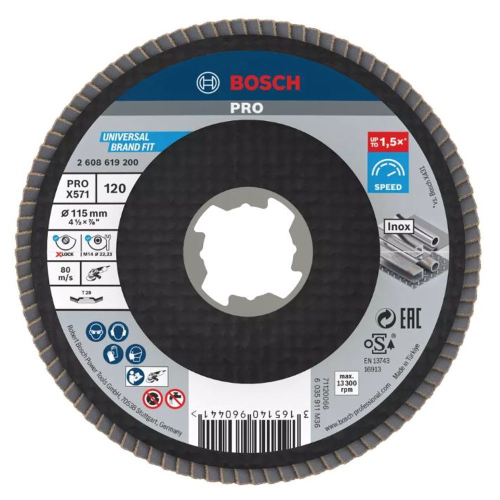 The Bosch PRO X571 Flap Disc, measuring 115mm, is designed for efficient metal grinding. It features aluminium oxide-zirconia grains for fast stock removal. Compatible with X-LOCK systems or traditional nut and thread angle grinders, this disc ensures quick and secure attachment. Ideal for professional and DIY applications, it offers reliable performance for various metalworking tasks.