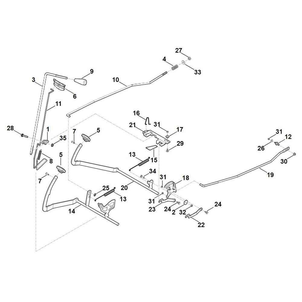 The Brake, Parking Brake, and Control Lever assembly for the Stihl RT 5097.1 Z Ride on Mower ensures efficient operation and safety. This assembly includes genuine Stihl parts designed to manage the braking system and control functions effectively. Essential for maintaining the mower's performance, it supports smooth operation and reliable stopping power.