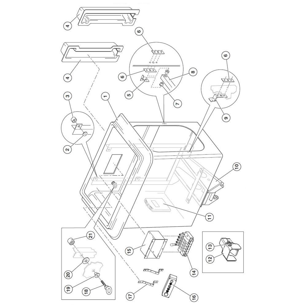 The Cage Assembly for Niftylift 120T (TM34T) Access Platforms is crafted from durable fibreglass, ensuring safety and reliability during operation. This assembly is essential for maintaining the structural integrity and functionality of the platform. It includes components such as brackets, fasteners, and panels, designed to fit seamlessly with the Niftylift 120T model.