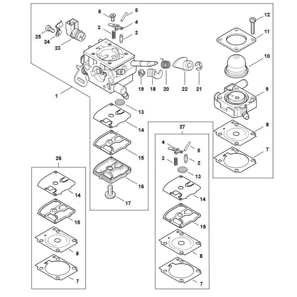The Carburetor 4147/53 Assembly is designed for the Stihl FS 461C Brushcutters, ensuring optimal fuel and air mixture for efficient engine performance. This genuine Stihl part includes components such as gaskets, diaphragms, and adjustment screws, crucial for maintaining the brushcutter's reliability and longevity. Regular maintenance with these parts helps prevent engine wear and ensures smooth operation.