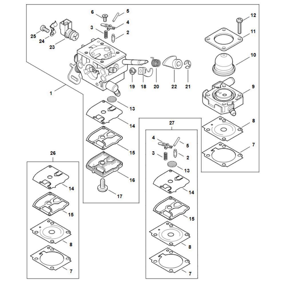 The Carburetor 4147/54 Assembly is designed for Stihl FS 411C Brushcutters, ensuring optimal fuel and air mixture for efficient engine performance. This genuine Stihl part includes components such as gaskets, diaphragms, and adjustment screws, essential for maintaining the brushcutter's reliability and longevity. Regular maintenance with these parts helps in achieving smooth operation and extended service life.
