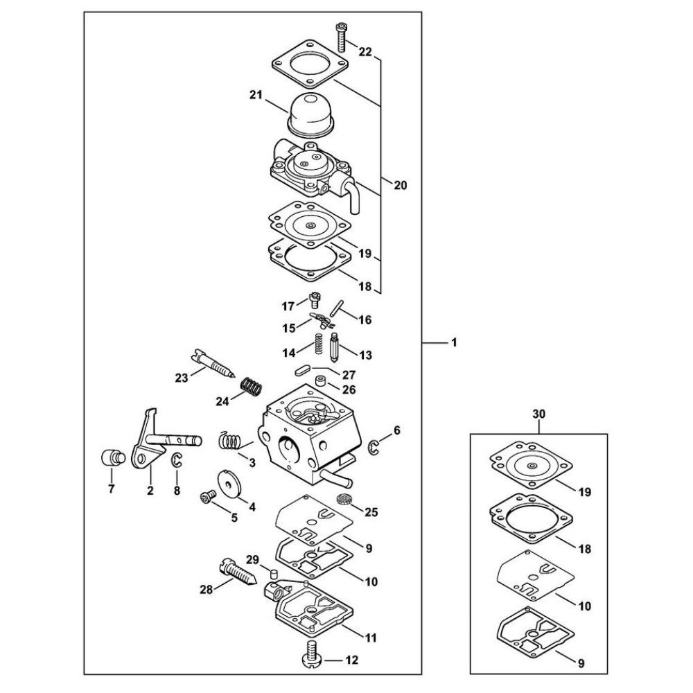 The Carburetor C1Q-S42 is designed for the Stihl HS 80 Hedge Trimmer, ensuring optimal fuel-air mixture for efficient engine performance. This genuine Stihl component helps maintain the trimmer's reliability and longevity. Key parts include the diaphragm, needle valve, and adjustment screws, all crucial for smooth operation. Available in various configurations to suit different maintenance needs.