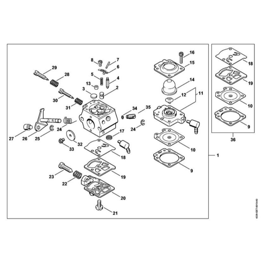 The Carburetor WT-412 is designed for the Stihl HS 80 Hedge Trimmer, ensuring optimal fuel and air mixture for efficient engine performance. This genuine Stihl component helps maintain the trimmer's reliability and longevity. It includes key parts such as gaskets, diaphragms, and adjustment screws, essential for smooth operation and maintenance.