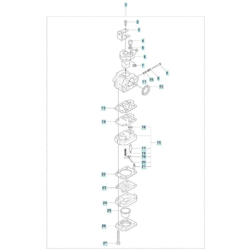 The Carburettor Assembly for the Husqvarna 143RST Brushcutter is designed to ensure optimal fuel and air mixture for efficient engine performance. This assembly includes components such as gaskets, springs, and levers, which are essential for maintaining the brushcutter's functionality. Regular maintenance of these parts can help prolong the life of your equipment.