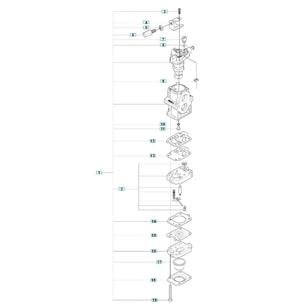 The Carburettor Assembly for the Husqvarna 350BF Blower is designed to ensure optimal fuel and air mixture for efficient engine performance. This assembly includes key components such as gaskets, springs, and levers, which are essential for maintaining the blower's reliability and longevity. Regular maintenance with genuine parts helps in reducing wear and extending the service life of your equipment.