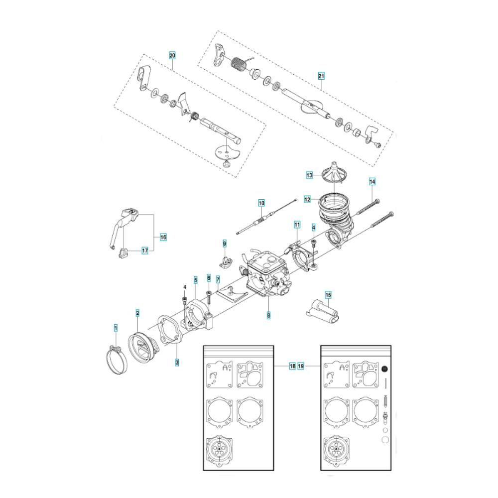 The Carburettor Assembly for the Husqvarna K970 Chain Concrete Cutter ensures optimal fuel delivery and engine performance. This assembly includes components such as gaskets, diaphragms, and springs, crucial for maintaining efficient operation. Designed for durability, it supports the cutter's demanding tasks by providing consistent power and reliability.