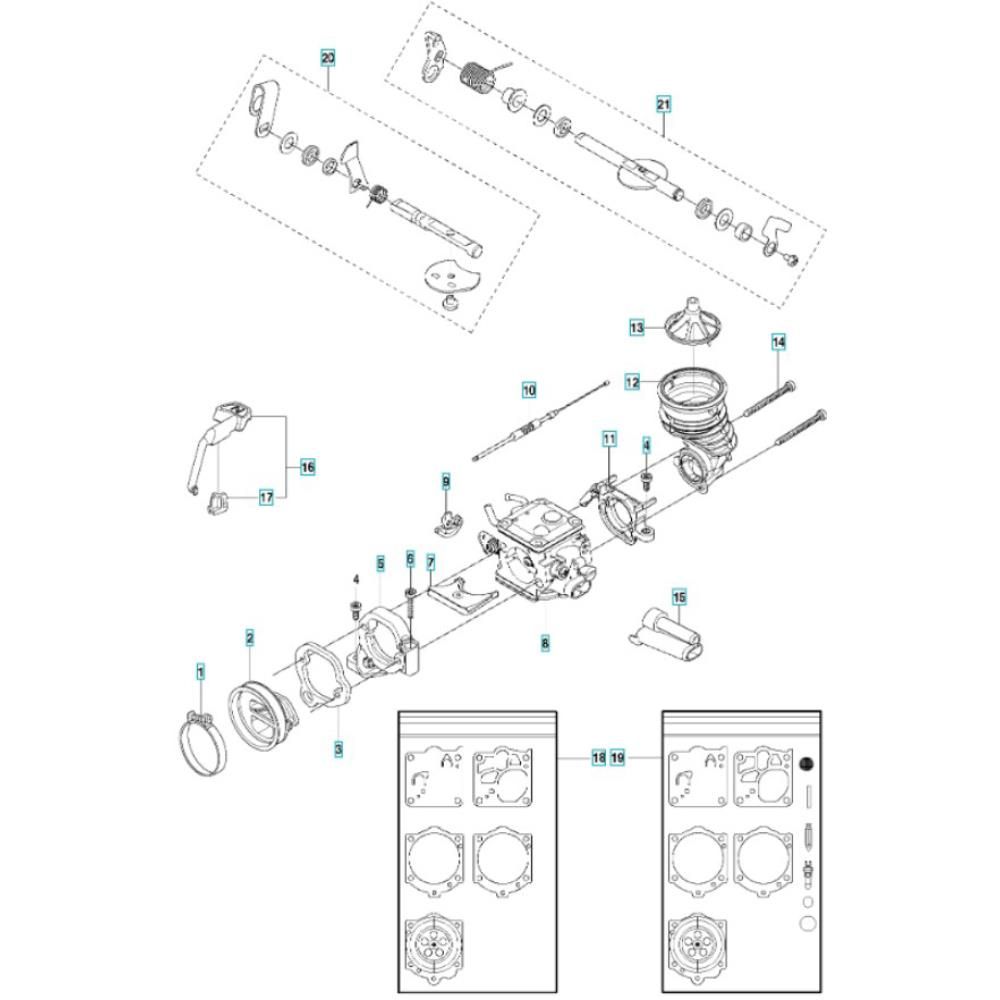 The Carburettor Assembly for the Husqvarna K970 Ring III Disc Cutter ensures optimal fuel-air mixture for efficient engine performance. Essential for maintaining the cutter's functionality, this assembly includes components such as gaskets, diaphragms, and adjustment screws. Regular maintenance of these parts helps in achieving precise cutting and prolongs the machine's lifespan.