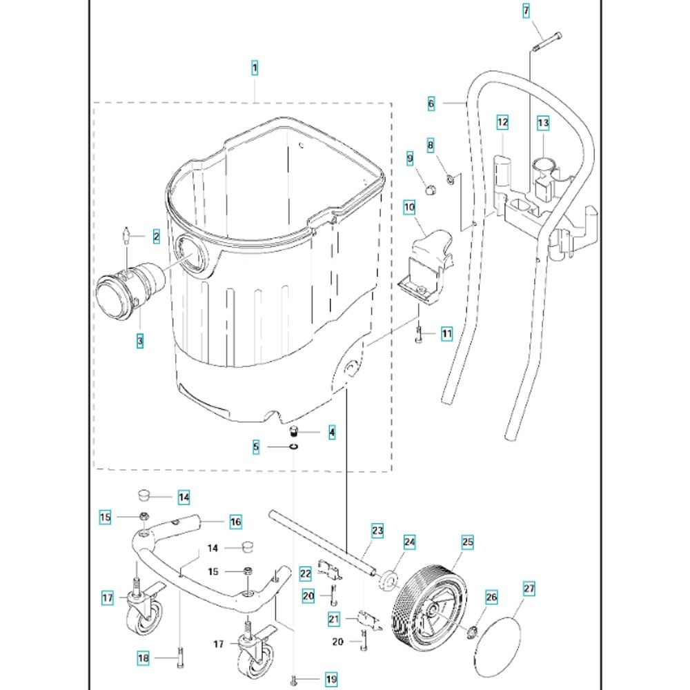 The Cart Assembly for the Husqvarna DC1400 Dust Extractor is designed to support and transport the dust extractor efficiently. This assembly includes components such as wheels, handles, and brackets, ensuring stability and ease of movement. Essential for maintaining the functionality and mobility of the dust extractor, it is a genuine Husqvarna part.