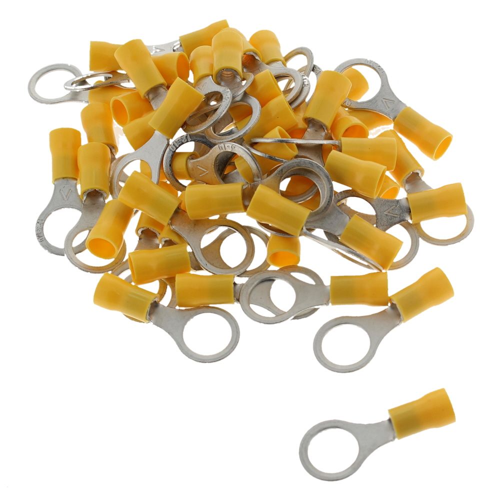 The Yellow 10 mm (3/8 in) Ring Terminal is a dependable crimp connector for creating secure, long‐lasting electrical joints on machinery, vehicles, and equipment. It combines a robust metal ring contact with a yellow insulated crimp barrel for clear identification and added handling safety. The 10 mm inner ring suits M10 studs and posts commonly found on control panels, batteries, grounding points, and junction blocks in construction plant, garden machinery, automotive, and industrial systems. Supplied in a pack of 50, these terminals are practical for routine maintenance and new installations alike. Designed for stranded wire and crimped using a suitable hand or ratchet crimp tool, they help maintain stable conductivity and resist loosening under vibration, making them a reliable choice for both professional and DIY users.
