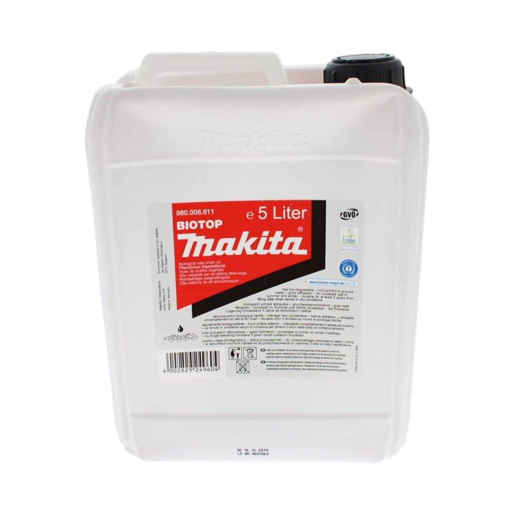 The Chain & Bar Oil - Bio 5 Litre for Makita DUC254 and DUC256 Chainsaws is a high-performance lubricant specifically designed for chainsaw maintenance. As a Genuine Makita Part, it ensures compatibility and optimal performance with your chainsaw. This bio-based oil is formulated to provide excellent lubrication to both the bar and chain, reducing wear and extending the lifespan of your equipment. Its unique formula resists flinging, ensuring that the oil stays where it is needed most, even during intensive use. Ideal for both professional tradespeople and DIY enthusiasts, this oil is essential for maintaining the efficiency and reliability of your Makita chainsaws.