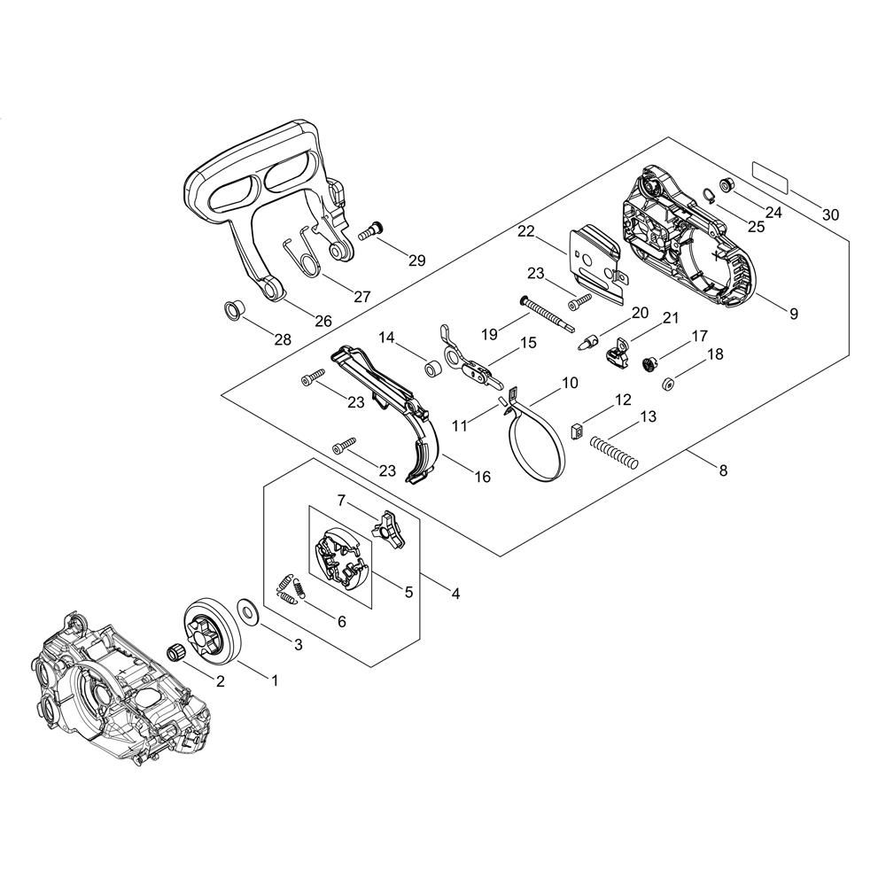The Chain Brake for the Shindaiwa 251WS Chainsaw is designed to enhance safety by stopping the chain in the event of kickback. This essential component helps protect users during operation and ensures compliance with safety standards. Genuine Shindaiwa parts ensure compatibility and reliability, maintaining the chainsaw's performance and longevity.