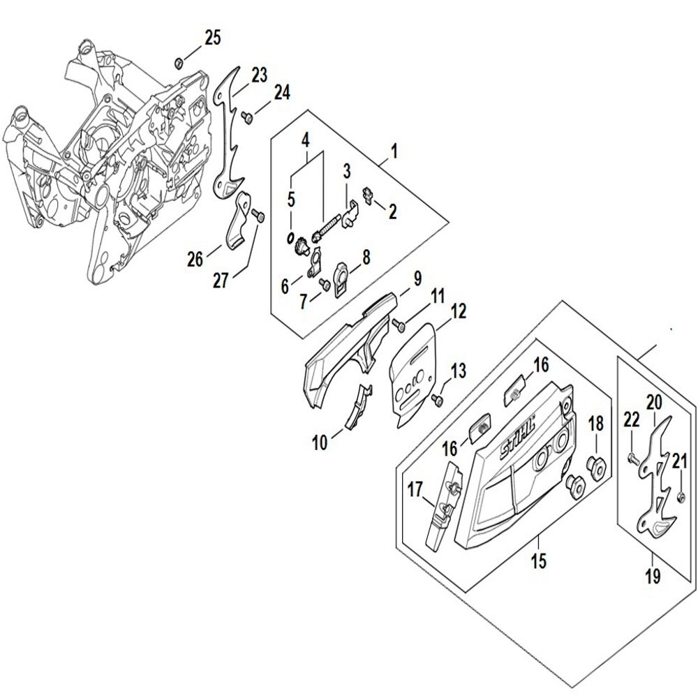 The Chain Tensioner Assembly for the Stihl MS 500i Chainsaw ensures optimal chain tension for efficient cutting performance. This assembly includes components like tensioning screws and guides, designed to maintain the correct chain alignment and tension. Essential for routine maintenance, it helps prevent chain slippage and enhances the chainsaw's longevity.