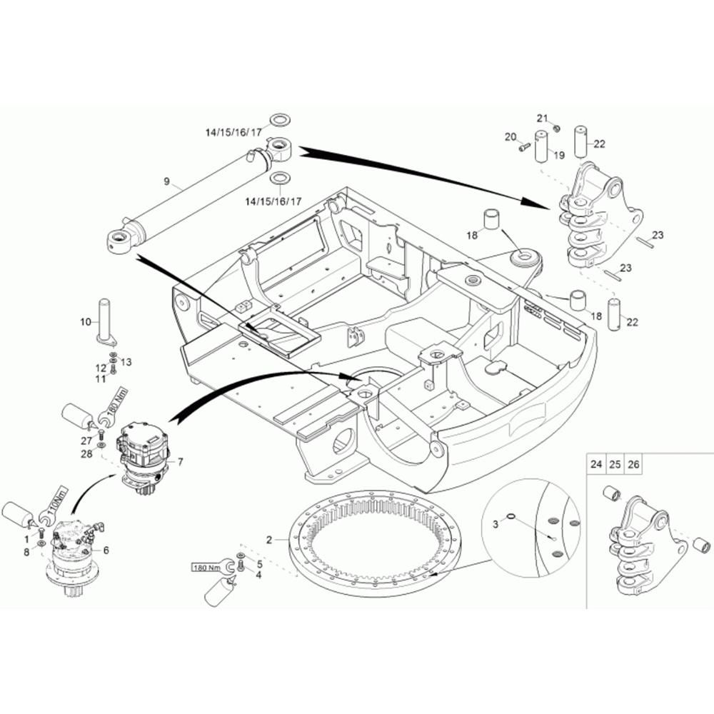 The Chassis Assembly for the Neuson 38Z3 Mini Excavator includes essential components to ensure structural integrity and operational efficiency. Designed for durability, it supports the machine's weight and movement. Key parts may include frames, mounts, and brackets, all crafted to meet Wacker Neuson's high standards. This assembly is crucial for maintaining the excavator's performance and longevity.