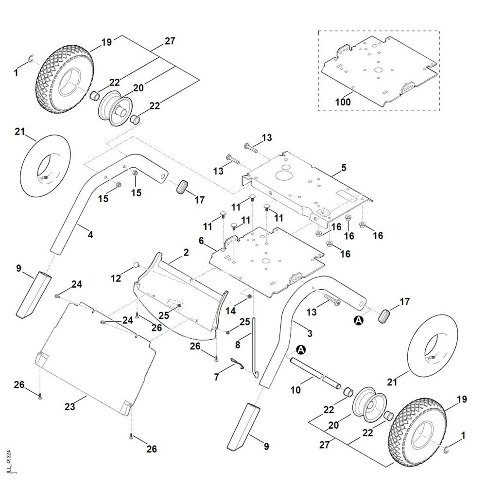 The chassis for the Stihl GH 460.0 C Shredder is a crucial component, providing structural support and housing for the machine's internal parts. This genuine Stihl part ensures compatibility and reliability, maintaining the shredder's performance and durability. Designed to withstand the demands of heavy-duty shredding tasks, it is essential for optimal operation.