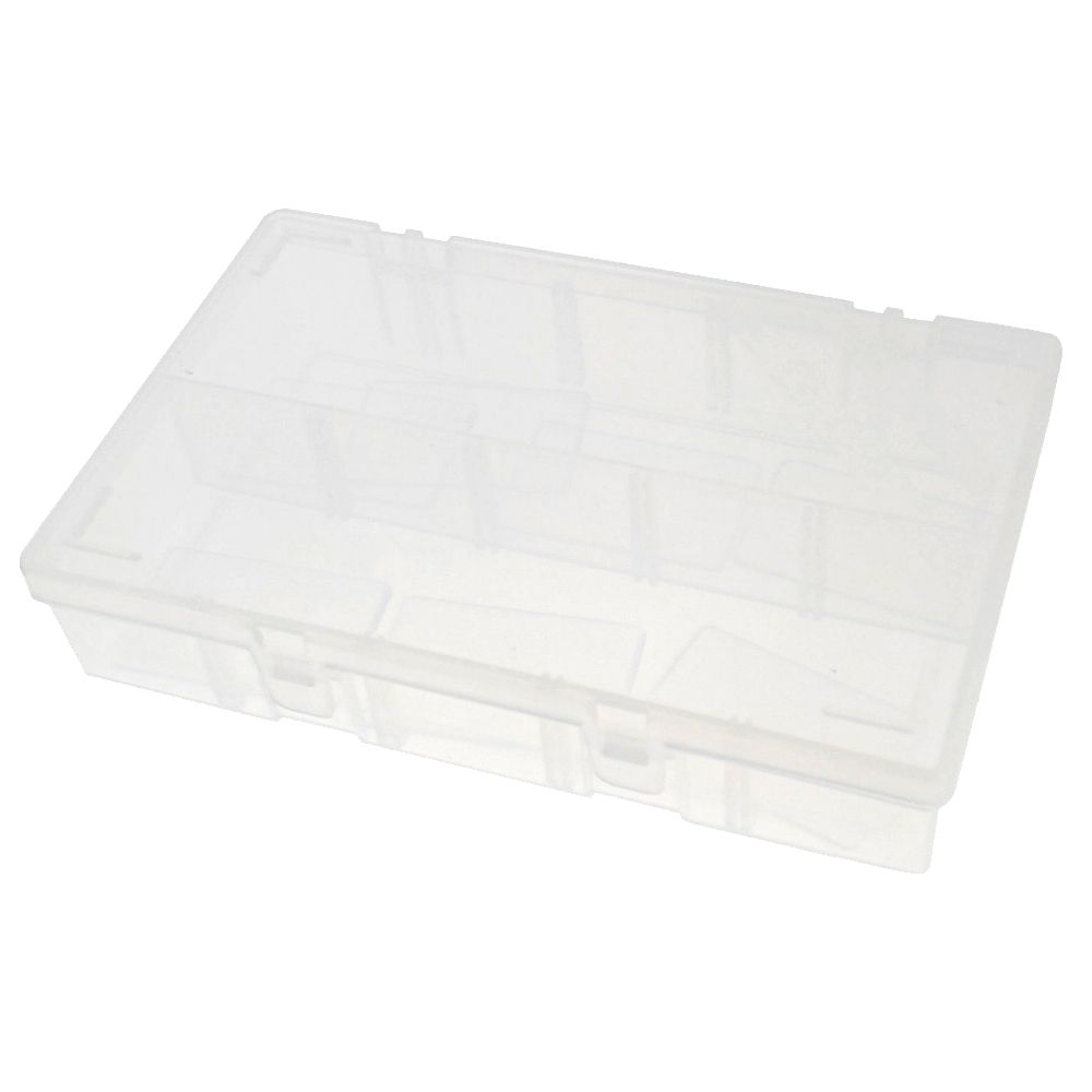 The Clear Mini Box Flip Top Lid with 8 Dividers is a compact, transparent storage case for organising small parts and fixings in workshops, vans, site boxes, and sheds. Made from clear plastic, it lets you see contents at a glance, reducing time spent searching for the right piece. The removable flip-top lid closes securely to help prevent spills in transit. Eight dividers allow you to tailor compartment sizes for items of different shapes. Its footprint suits most toolboxes and drawer systems. Dimensions: 7 inches (17.8 cm) wide, 4 inches (10.2 cm) deep, and 1.5 inches (3.8 cm) high. Suitable for tradespeople, DIY users, and maintenance teams handling spares for construction and garden machinery. Manufacturer Part Number (MPN): 105 001.