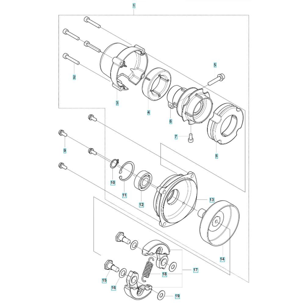 The Clutch Assembly for the Husqvarna 143RST Brushcutter is designed to ensure efficient power transfer from the engine to the cutting head. This assembly includes key components such as springs, shoes, and drums, which work together to engage and disengage the cutting mechanism. Regular maintenance of these parts can help maintain optimal performance and prolong the lifespan of your brushcutter.