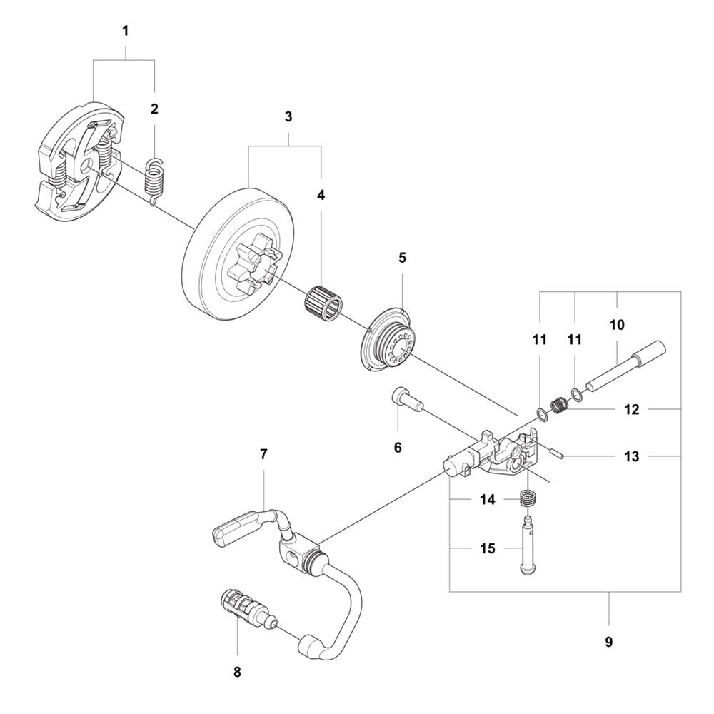 The Clutch and Oil Pump Assembly for the Husqvarna 540XP Mark III Chainsaw ensures optimal performance and longevity. This assembly includes essential components such as the clutch drum, sprocket, and oil pump, which work together to deliver efficient power transmission and lubrication. Regular maintenance with genuine Husqvarna parts helps maintain the chainsaw's reliability and efficiency.