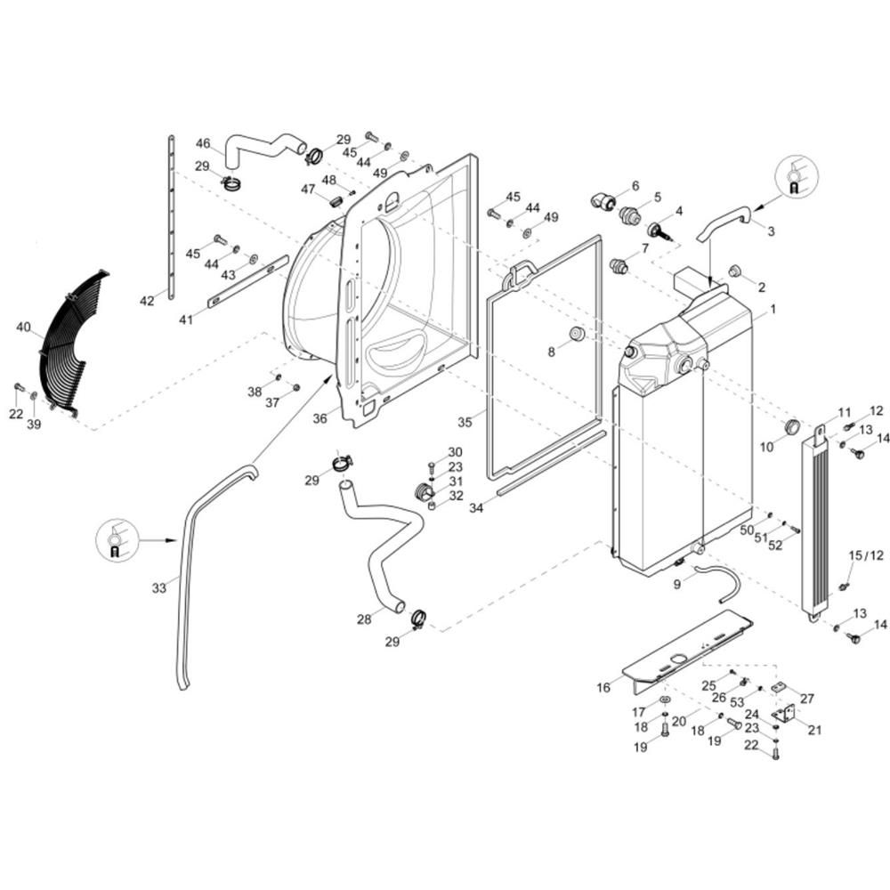The Combi-Cooler (404J-E22T) Assembly is designed for the Wacker EZ80 Mini Excavator, ensuring optimal cooling performance. This assembly includes key components such as radiators, fans, and hoses, which work together to maintain engine temperature and efficiency. Genuine Wacker Neuson parts guarantee compatibility and reliability for your excavator's cooling system.