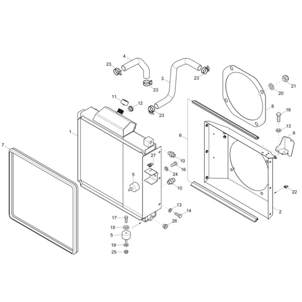 The Combi-Cooler Assembly for the Wacker DW20 Dumper is designed to regulate engine temperature and ensure optimal performance. This assembly includes components such as radiators, fans, and hoses, which work together to dissipate heat efficiently. Essential for maintaining the dumper's reliability, it helps prevent overheating during heavy-duty operations.