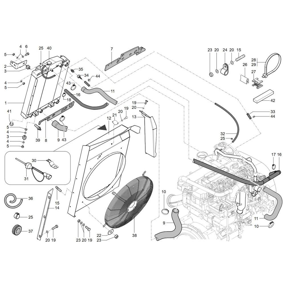 The Combi-Cooler Assembly for the Wacker TH730 (415-34) Telehandler is designed to ensure optimal temperature regulation and efficient operation. This assembly includes components such as radiators, fans, and hoses, which work together to maintain engine cooling and hydraulic system efficiency. Genuine Wacker Neuson parts ensure compatibility and reliability for your telehandler.
