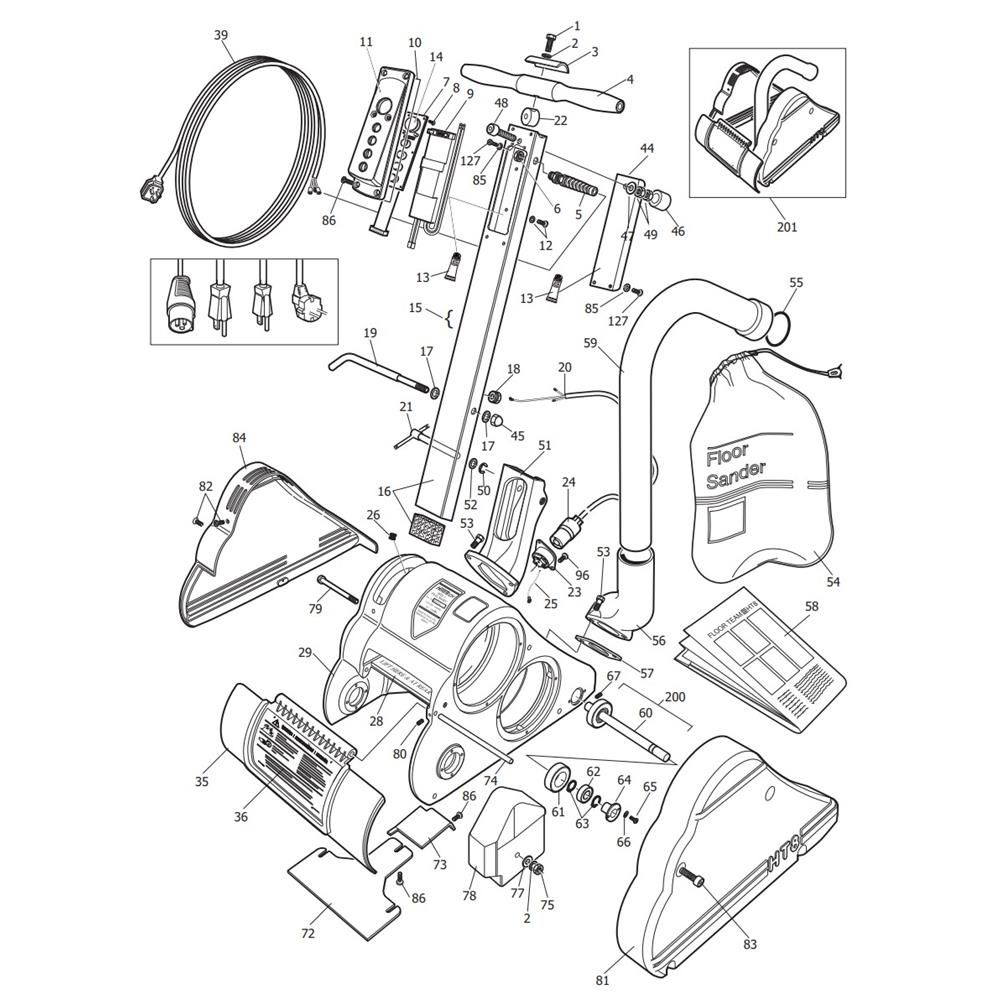 The Complete Assembly for the Hiretech HT8 Multi-Speed Floor Sander includes essential components to ensure optimal performance and longevity. Designed for both genuine and non-genuine parts, this assembly supports efficient sanding operations. Key components may include belts, drums, switches, and bearings, all crucial for maintaining the sander's functionality.