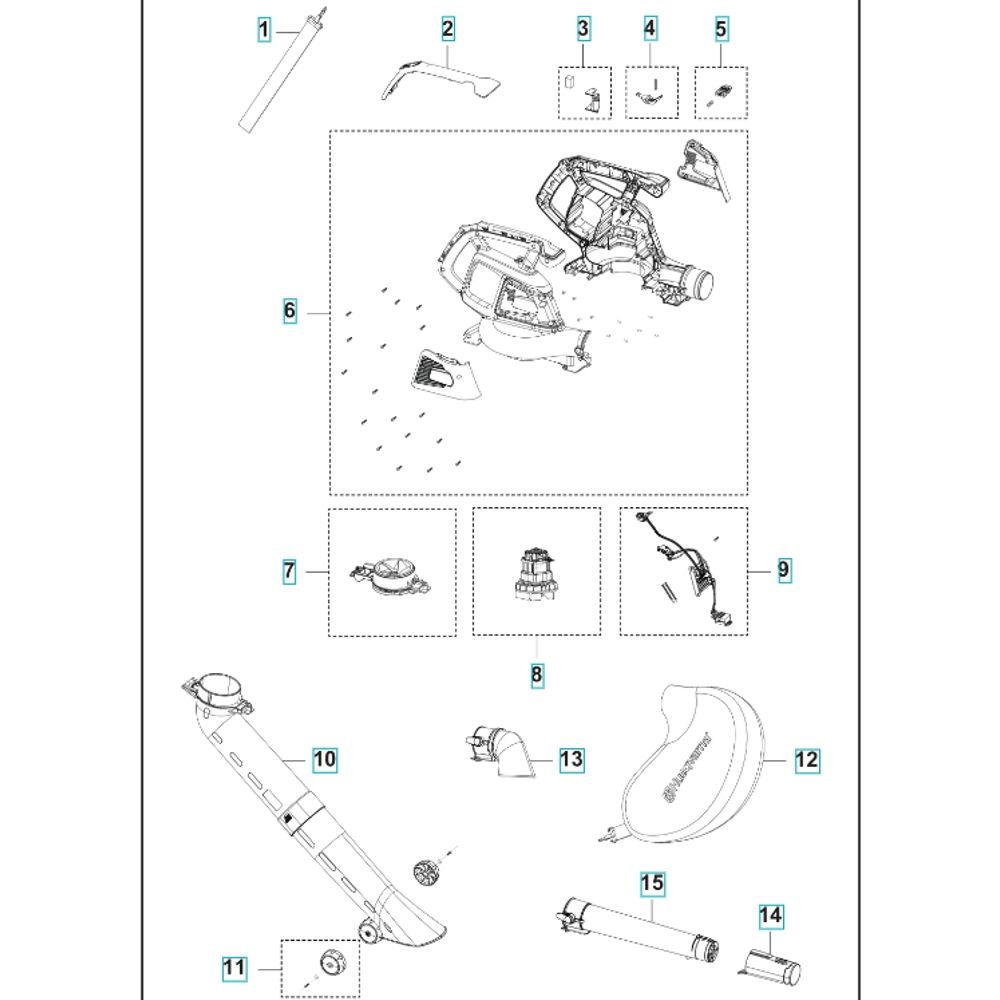 The Complete Assembly for the Husqvarna 120iBV Battery Blower includes essential components to ensure optimal performance and longevity. Designed for efficient maintenance and repair, this assembly helps maintain the blower's functionality by providing genuine Husqvarna parts. Typical components include filters, nozzles, and housing elements, ensuring reliable operation.
