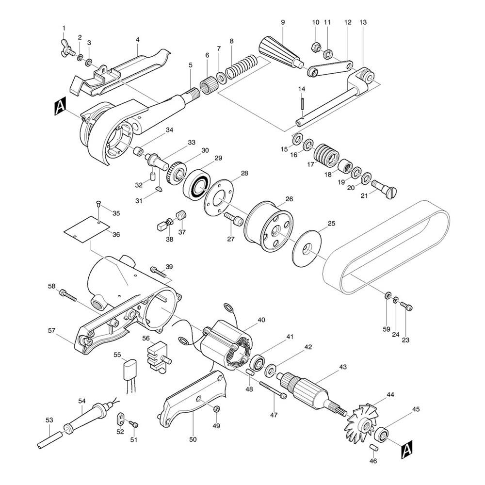 The Complete Assembly for the Makita 9030 Belt Sander includes all necessary components to ensure optimal performance and longevity. This genuine Makita assembly is designed for efficient sanding tasks, providing reliable operation and precision. Components typically include belts, rollers, tensioners, and dust collection parts, ensuring a comprehensive solution for maintenance and repair needs.