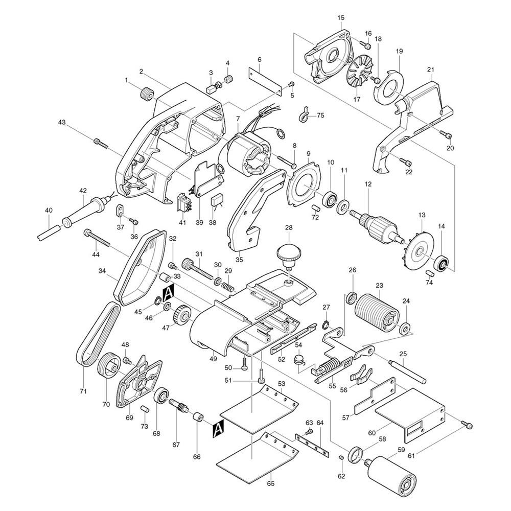 The Complete Assembly for the Makita 9402 Belt Sander includes all necessary components to ensure optimal performance and longevity. This assembly is designed to facilitate routine maintenance and repairs, featuring genuine Makita parts. Key components may include belts, rollers, tensioners, and dust bags, all essential for efficient sanding operations.