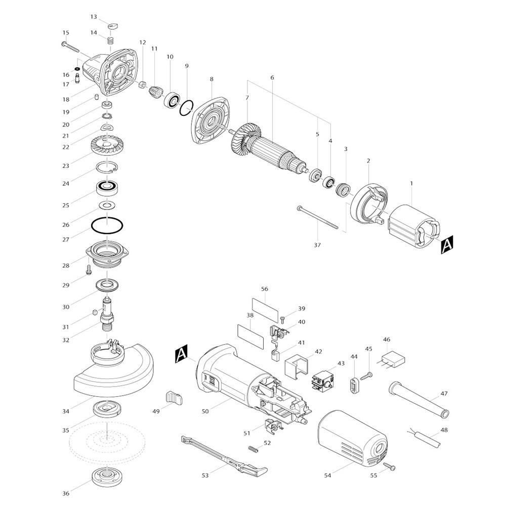 The Complete Assembly for the Makita 9558NBR Angle Grinder includes essential components to ensure optimal performance and longevity. This assembly is designed to facilitate routine maintenance and repairs, helping to maintain the grinder's efficiency. Key parts such as gears, bearings, and switches are included, providing comprehensive support for various grinding tasks.