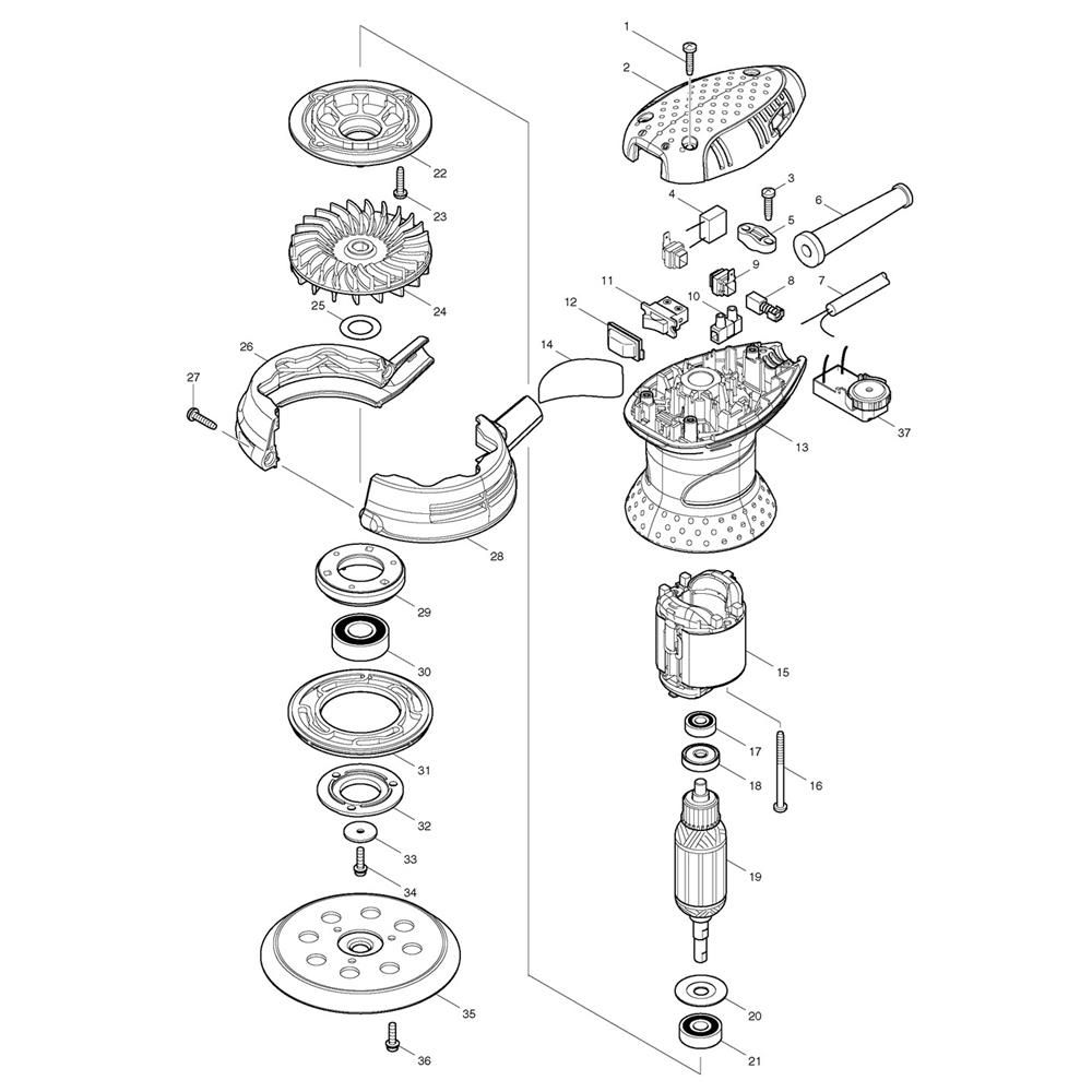 The Complete Assembly for the Makita BO5031 Sander includes essential components to ensure optimal performance and longevity. This genuine Makita assembly is designed for efficient sanding tasks, providing reliable operation. Key components may include pads, clamps, levers, and seals, all contributing to the sander's smooth function.