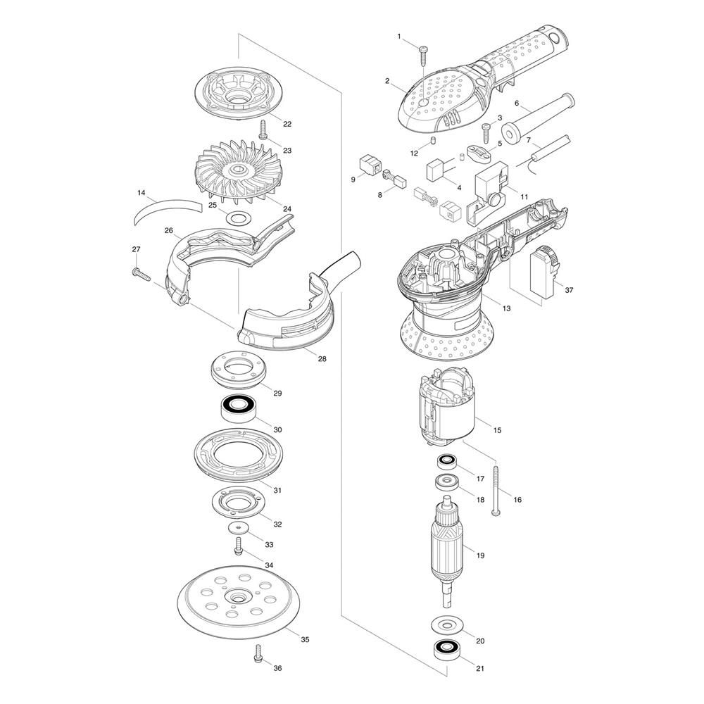 The Complete Assembly for the Makita BO5041 Sander includes all necessary components to ensure optimal performance and longevity. This assembly is designed to maintain the sander's efficiency and includes parts such as pads, clamps, and seals. Ideal for routine maintenance and repairs, it helps keep your sander in top condition.