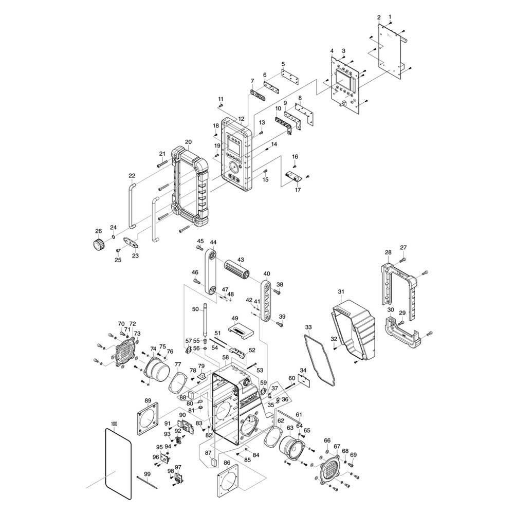 The Complete Assembly for the Makita DMR107 Radio includes genuine parts essential for maintaining optimal performance and longevity. This assembly ensures reliable operation by providing components that support the radio's functionality. Typical parts may include knobs, dials, speakers, and antennae, all designed to fit seamlessly with the Makita DMR107 model.