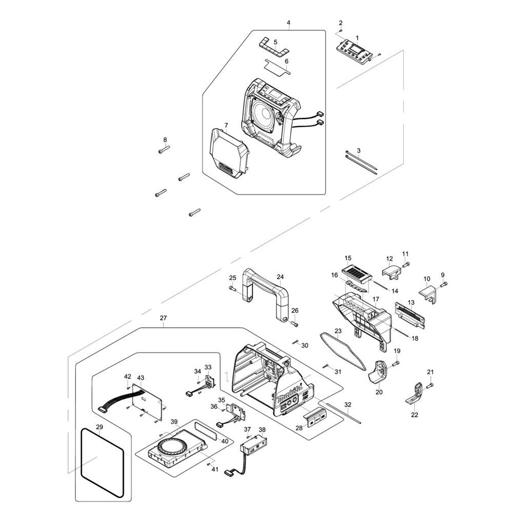 The Complete Assembly for Makita DMR202 Radio includes essential components to ensure optimal performance and longevity. Designed for maintenance and repair, this assembly helps maintain sound quality and functionality. Typical components include speakers, knobs, circuit boards, and antennas, all genuine Makita parts.