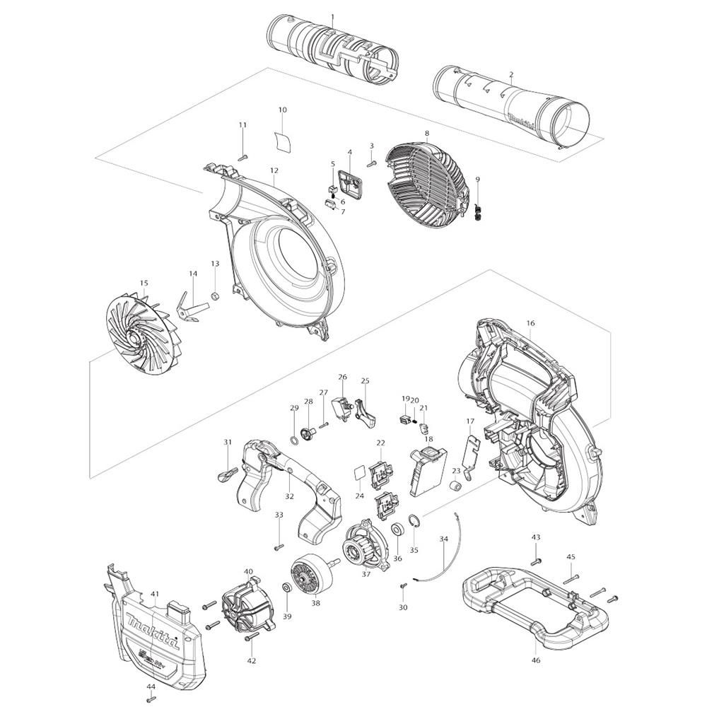 The Complete Assembly for the Makita DUB363 Blower includes genuine parts essential for maintaining optimal performance. This assembly ensures efficient operation by providing components like housings, fans, and seals, which are crucial for airflow and engine protection. Ideal for routine maintenance and repairs, it helps extend the blower's service life.