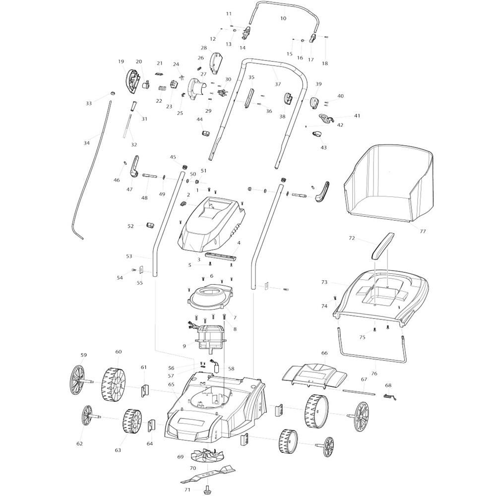 The Complete Assembly for the Makita ELM3710 Mower includes essential components to ensure optimal performance and longevity. Designed for easy maintenance and repair, this assembly helps maintain the mower's efficiency. Components such as blades, belts, and fasteners are included to support smooth operation and reliable cutting performance.