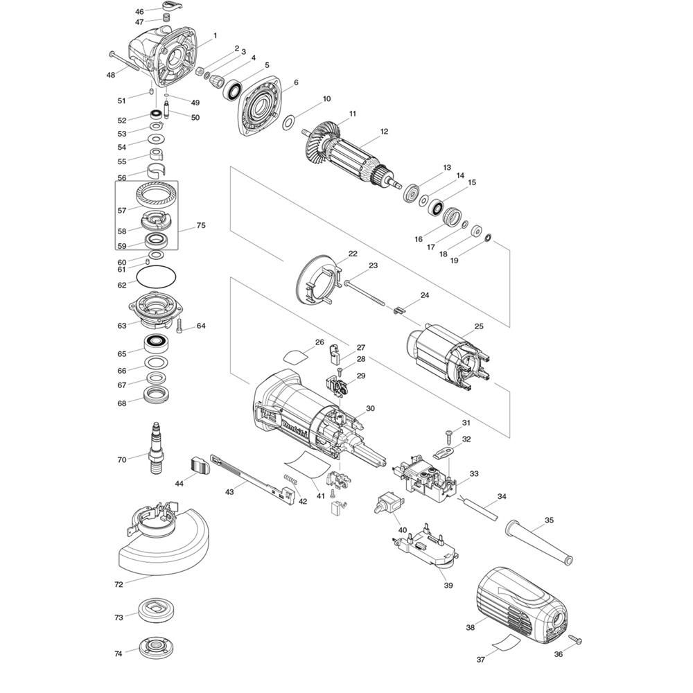 The Complete Assembly for the Makita GA5040C Angle Grinder includes essential components to ensure optimal performance and longevity. This assembly is designed to facilitate maintenance and repair, featuring genuine Makita parts that help maintain the grinder's efficiency. Components typically include gears, bearings, switches, and housings, all crucial for smooth operation.