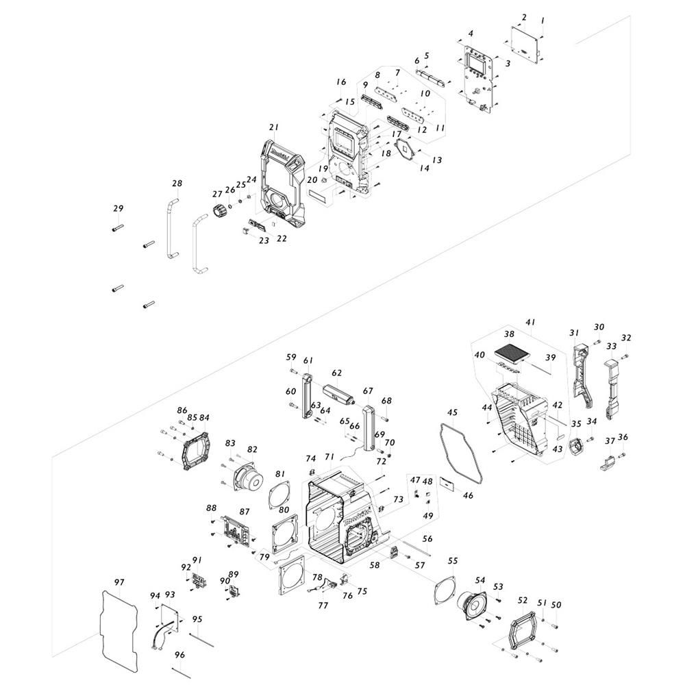The Complete Assembly for the Makita MR002G Radio includes essential components to ensure optimal functionality and longevity. Designed for maintenance and repair, this assembly helps maintain sound quality and device performance. Available parts may include knobs, dials, antennas, and internal wiring, all genuine Makita components.