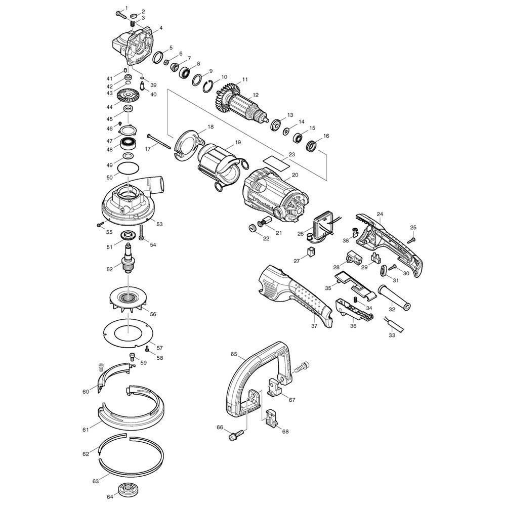 The Complete Assembly for the Makita PC5000C Planer includes all necessary components to ensure optimal performance and longevity. This assembly is designed to maintain the planer's efficiency by providing genuine Makita parts. Typical components include blades, belts, and housings, which are essential for smooth operation and precise planning tasks.