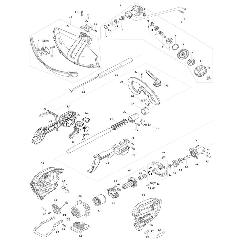 The Complete Assembly for the Makita UR007G Cordless Trimmer includes essential components to ensure optimal performance and longevity. Designed for efficient trimming, this assembly helps maintain the trimmer's functionality by providing genuine Makita parts. Components such as blades, guards, and handles are available to suit various maintenance needs.