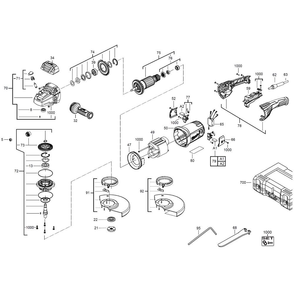 The Complete Assembly for the Milwaukee AGV22 Angle Grinder includes essential components to ensure optimal performance and longevity. Designed for maintenance and repair, this assembly helps maintain the grinder's efficiency and safety. Typical components may include gears, bearings, and switches, all genuine Milwaukee parts.