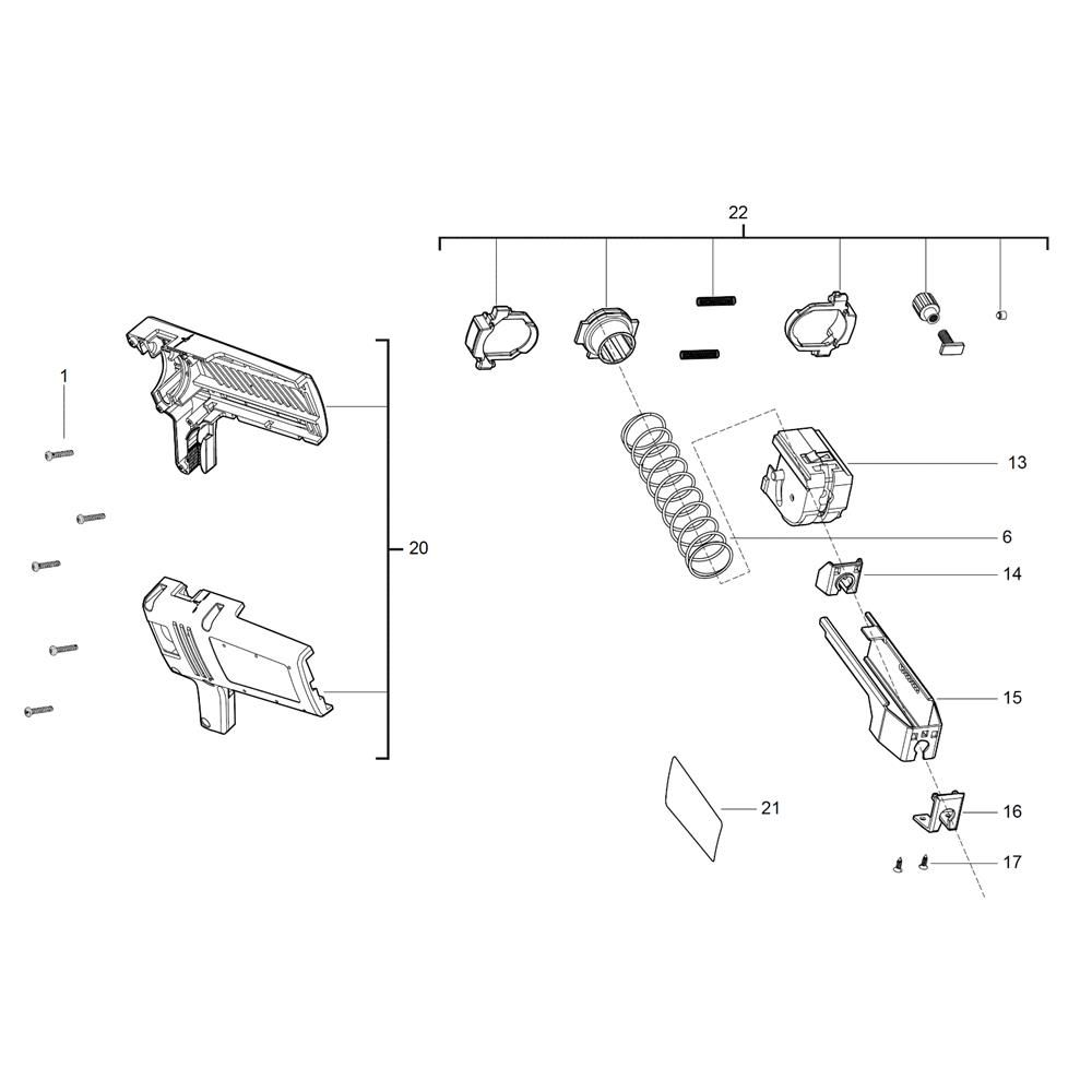 The Complete Assembly for the Milwaukee CA55 Cordless Screwdriver includes essential components to ensure optimal performance and longevity. Designed for maintenance and repair, this assembly helps maintain the tool's efficiency and reliability. Typical components include gears, switches, and housings, all genuine Milwaukee parts.