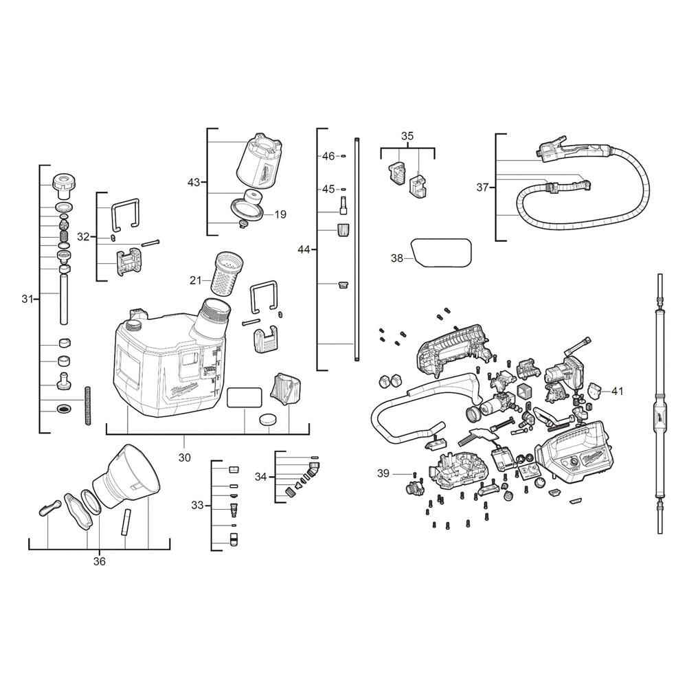 The Complete Assembly for the Milwaukee M12 BHCS3L Sprayer includes essential components to ensure optimal performance and longevity. This assembly is designed to facilitate efficient spraying operations, providing reliable functionality. Components may include nozzles, hoses, seals, and connectors, all crafted to meet Milwaukee's high standards.