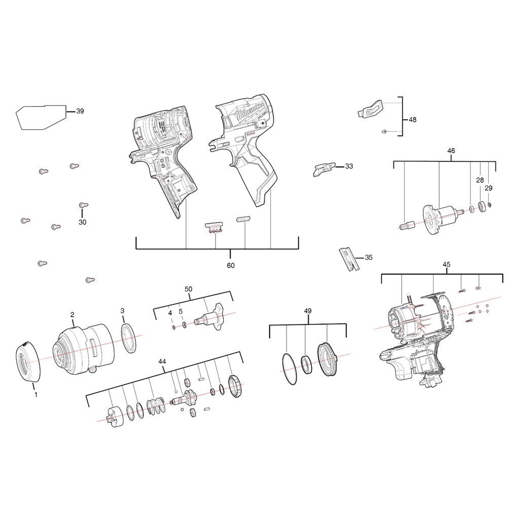 The Complete Assembly for the Milwaukee M12FIW14 Cordless Impact Wrench includes genuine parts to ensure optimal performance and longevity. This assembly is crucial for maintaining the tool's efficiency and includes components like gears, motors, and housings. Designed for both routine maintenance and repairs, it helps in delivering consistent torque and power.
