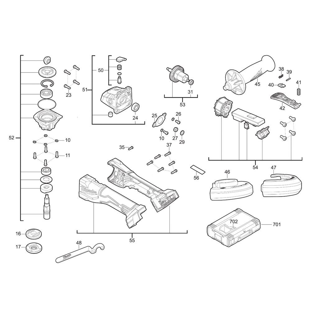 The Complete Assembly for the Milwaukee M18BLSAG125XPD Cordless Angle Grinder includes essential components to ensure optimal performance and longevity. Designed for maintenance and repair, this assembly helps maintain the grinder's efficiency and reliability. Components may include gears, switches, brushes, and housings, tailored to fit the Milwaukee model.