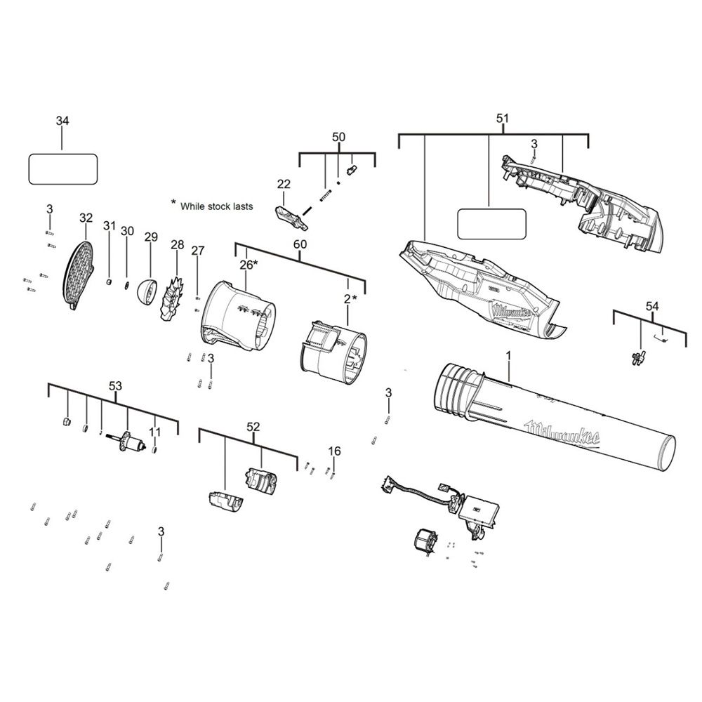 The Complete Assembly for the Milwaukee M18FBL Blower includes essential components to ensure optimal performance and longevity. This assembly is designed to support routine maintenance and repair, featuring genuine and non-genuine parts. Key components may include housings, impellers, fasteners, and seals, all contributing to efficient operation and durability.