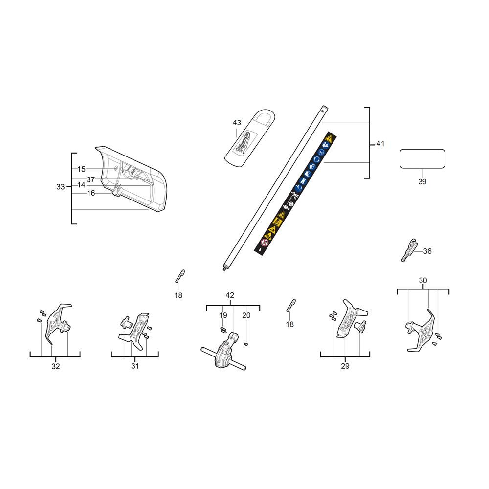 The Complete Assembly for the Milwaukee M18FOPH-CA Attachment includes genuine Milwaukee Quik-Lok parts designed for optimal performance and durability. This assembly ensures efficient operation and easy maintenance of your equipment. Components such as connectors, fasteners, and adaptors are included to support various attachment needs.