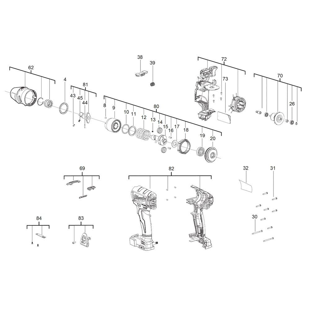 The Complete Assembly for the Milwaukee M18ONEIWP12 Cordless Impact Wrench includes essential components to ensure optimal performance and longevity. This assembly is designed to support the tool's powerful operation, featuring parts such as gears, bearings, and seals. Ideal for maintaining the wrench's efficiency and reliability in demanding tasks.