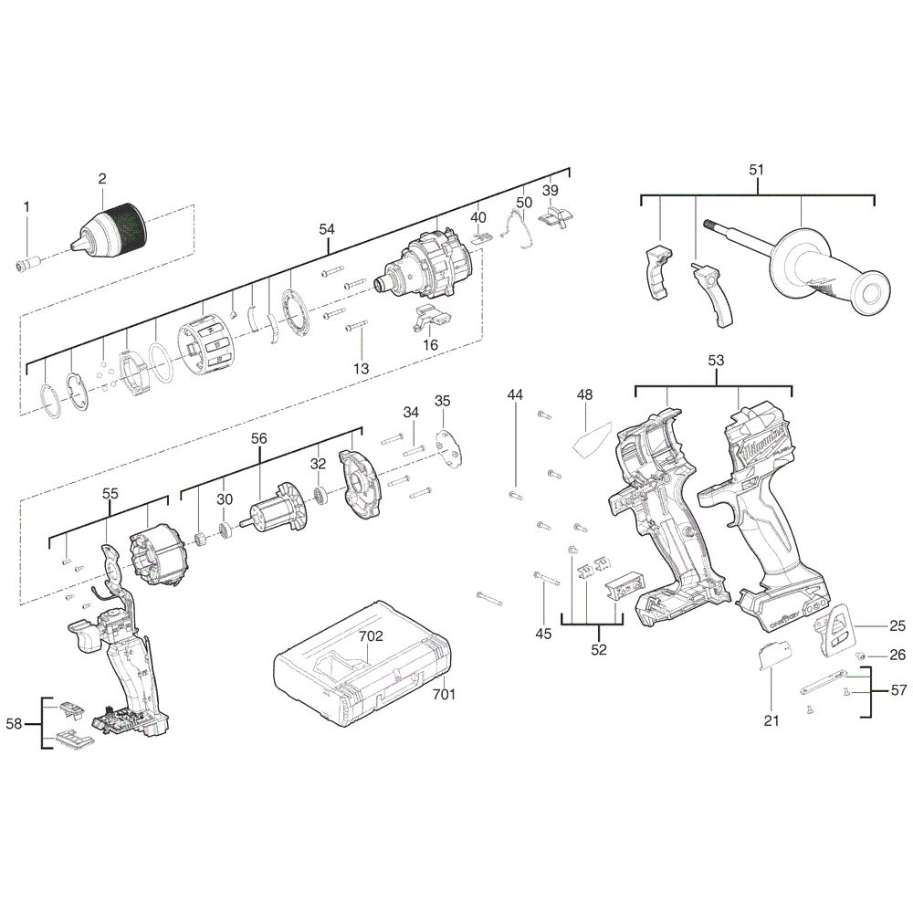 The Complete Assembly for the Milwaukee M18ONEPD2 Percussion Drill includes both genuine and non-genuine parts to ensure optimal performance. This assembly is designed to support the drill's functionality, featuring components such as gears, chucks, and switches. Ideal for maintenance and repair, it helps maintain the drill's efficiency and longevity.